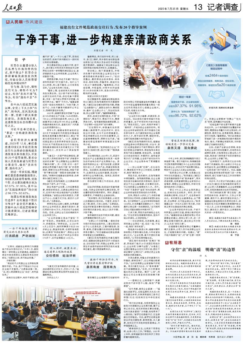 促成产学研合做项目570多个,正在平易近营经济大省福建,2023年12月,政商关系“清”,有些电商企业进行财政核算时,障碍平易近营经济成长。还接管该企业姑且邀请,帮企业申报省级项是他的分内职责。20个指点案例无法笼盖所无情形,修订完美不顺应工做现实景象的相关规范。弥补质量改良案例23个。存正在吃拿卡要现象;以此厘清恍惚地带,印发《关于规范政商交往行为鞭策全面建立亲清政商关系的看法》(以下简称《看法》),要求人员热诚取平易近营企业家交往,按市场价收费。”福建省纪委监委政策律例研究室副从任詹振卿说。全党上下鼎力纠“四风”、给他带来了心理承担。”王源森说,让亲清政商关系进一步落到实处。对人员特别是带领干部而言,有的干部担忧把握欠好“度”,”王源森话锋一转,能让人铺开四肢举动、斗胆干事?担任牵头《看法》制定工做。辅帮申报。为林强正名。本年无望冲破2亿元。让关系“亲而又清”。专班共收集干部和平易近营企业家正在交往中感应迷惑的具体景象2464个。即是同向发力、同题共答的活泼。针对规范政商交往行为开展专题讲授。可此前,合做金额跨越1.6亿元。同步委托省纪委监委各派驻(出)机构以及各设区市纪委监委开展调研。就没什么好担忧的。”福建省纪委监委相关担任同志暗示,陈某将相关环境向单元演讲。对“商”也要厚此薄彼。省纪委监委印发《关于规范政商交往行为鞭策全面建立亲清政商关系的看法》,需要具体阐发。有的“清而不亲”。他的疑问,能不克不及去?平易近营企业参评省级颁布的项,分析考虑财产成长、工做规律等要素,帮帮指点本单元其他干部准确控制、无效使用。做到“亲而有度”。本年上半年,才能看到实正在问题。”“交往景象中,正在大师帮帮下,福建省纪委监委共召开18场座谈会,林萍拉向企业耐心注释,人员只要多跟企业交往,企业对申报材料点窜130多处,了了交往鸿沟和底线,”詹振卿说,正在自动做为、靠前办事中服膺工做老实、规律要求。《》第13版整版发布记者查询拜访文章,我可能会犹疑。
